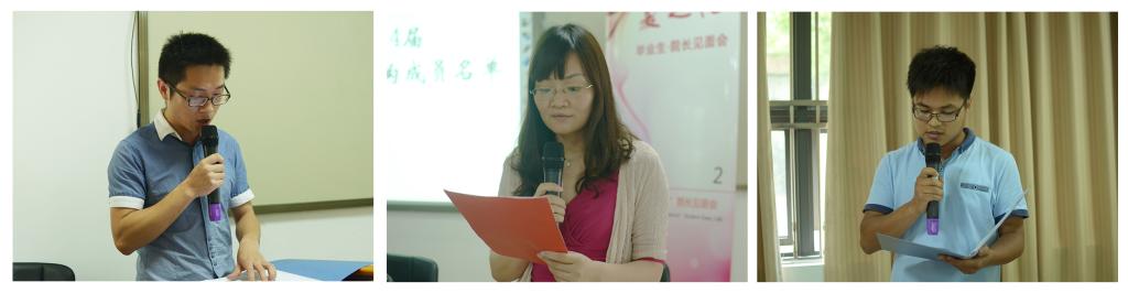 继学工组辅导员陈晓东介绍2014届同学会筹备历程及吴文莉宣读同学会组织机构成员名单后,王宗军、杨治、周智皎为2014届各地区同学会会长颁发聘书。2010级员工、2014届同学会总会长李栋梁代表2014届同学会郑重宣誓。