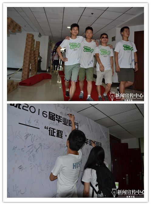 上:2016届毕业学子走过红毯 下:2016届毕业学子在签名墙上签名