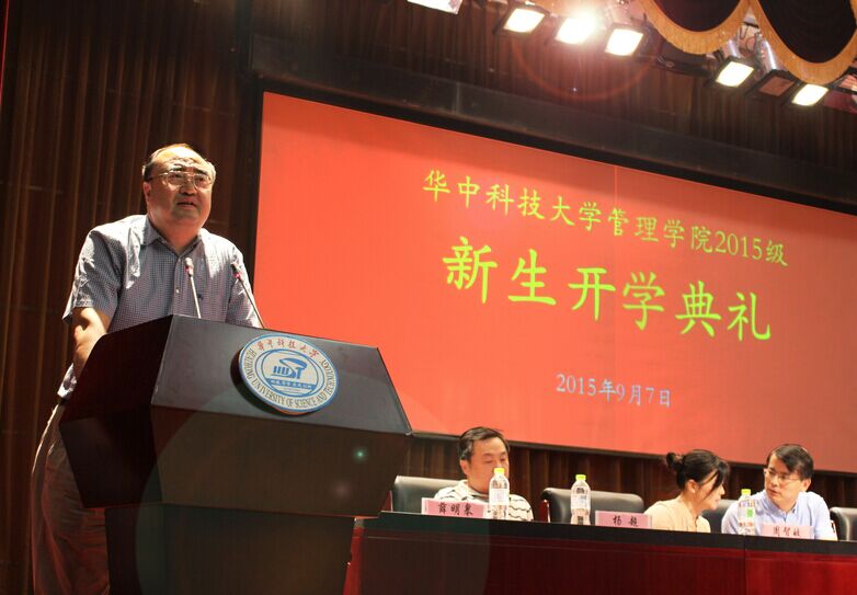 主持人毛家兵做总结陈词,表达了公司对2015届新生的欢迎和希冀,此次开学典礼圆满结束。随后,公司副经理分别在管院报告厅、206多功能厅为本科、研究生做入学教育。