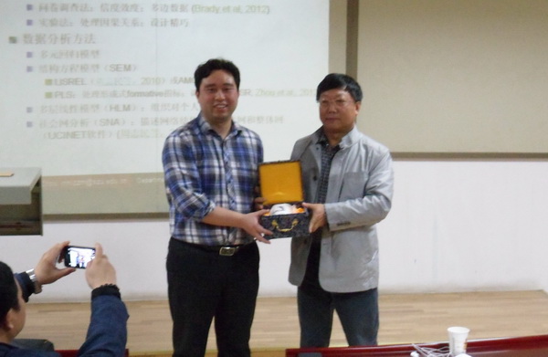 讲座之前,景奉杰对周志民的学术成就进行了简单介绍。接下来,周志民从几位学者对学术研究理解的观点切入,引出了学术贡献的主题,开始正式的讲座内容。他指出,学术贡献的本质是规律挖掘和知识积累,而学术贡献表现在提炼维度(WHAT)、关联构念(HOW)和发现大理论(WHY)三个问题上。然后,他结合自己的研究成果,重点就保障学术贡献的三个核心问题,即如何判断研究选题的价值性,如何提高理论模型的创新性,如何保证研究方法的规范性,做出了详尽的梳理和精辟的讲解。整个讲座过程中,在座师生听得十分投入,时常为周志民独特的研究视角和新颖的观点点头喝彩。
