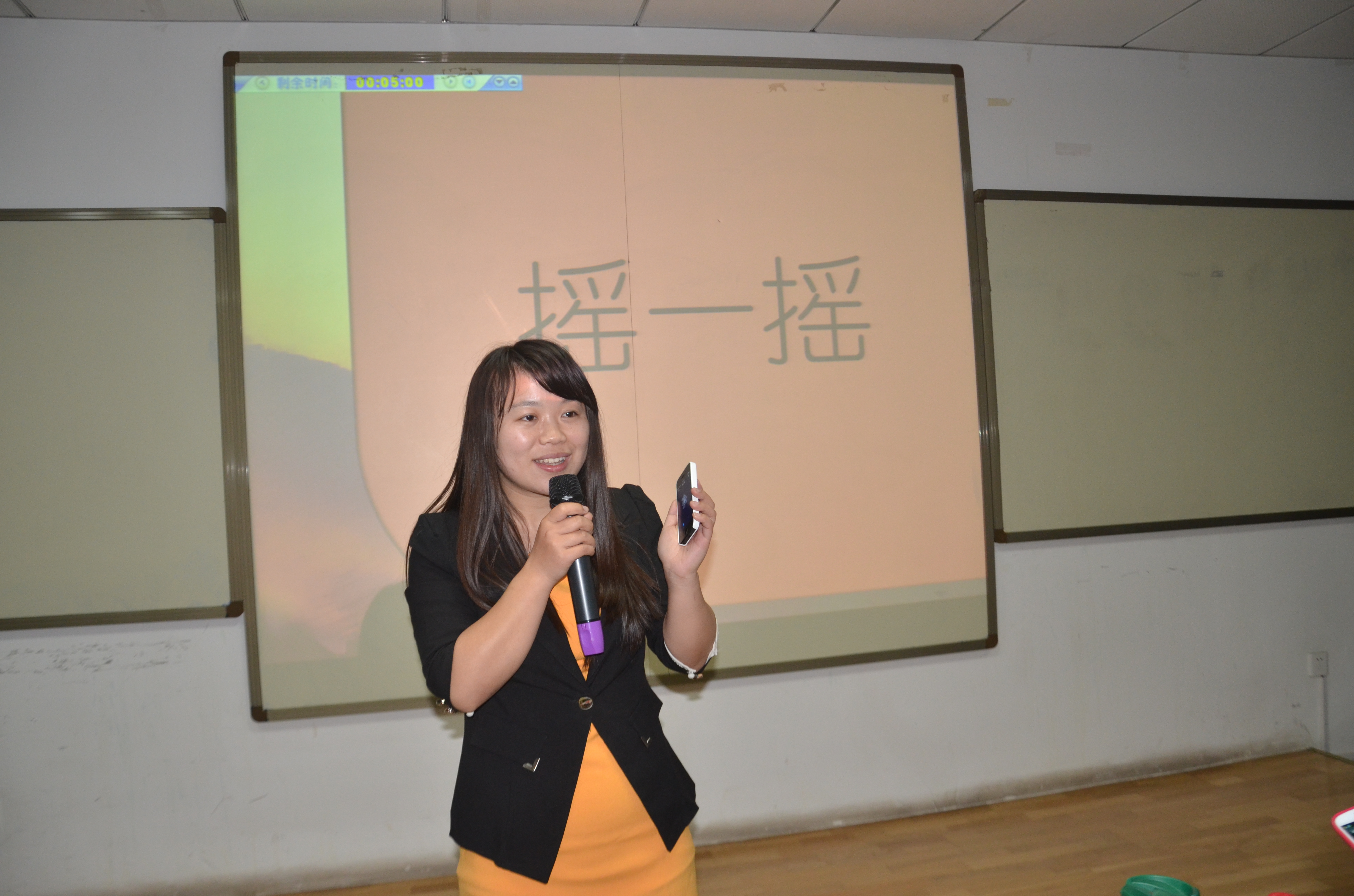 在谷宗洪带领大家一起进行了摇一摇的游戏环节后,比赛继续进行。财务1301班的代君丽播放了一段室友精心准备的加油视频。会计1201班王家慧的寝室里有非常多生机勃勃的盆栽,她对室友体贴入微的照顾使室友们给了她“散发着母性光辉”的评价。营销1301班的袁宇政说,自己有点子王、活动狂人、技术大神、天才小厨神等诸多称呼,室友上台对他真挚的感谢之语足见他们寝室的情谊之深。