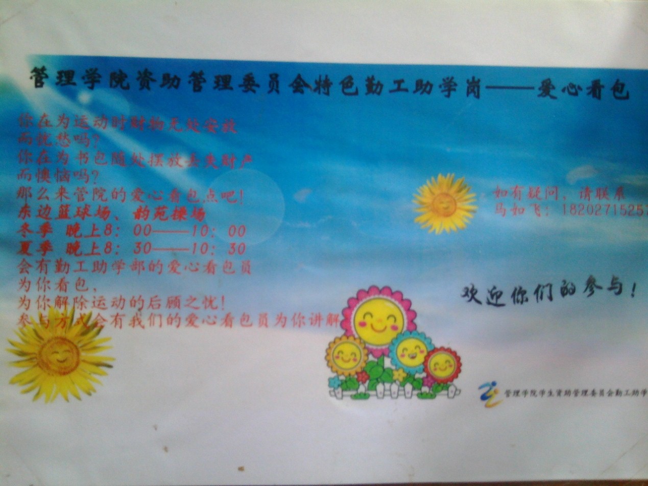 之后,由部员马如飞统计看包员和巡查员们的工作记录,并为之发放工资和奖励。每天存包数量超过50,最多次数达159个,一个学期累计服务同学近万人次。