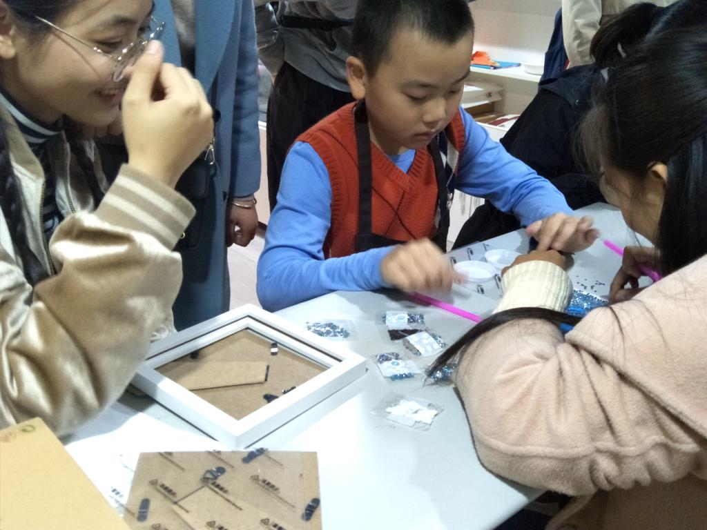 志愿者和孩子们一起完成钻石画