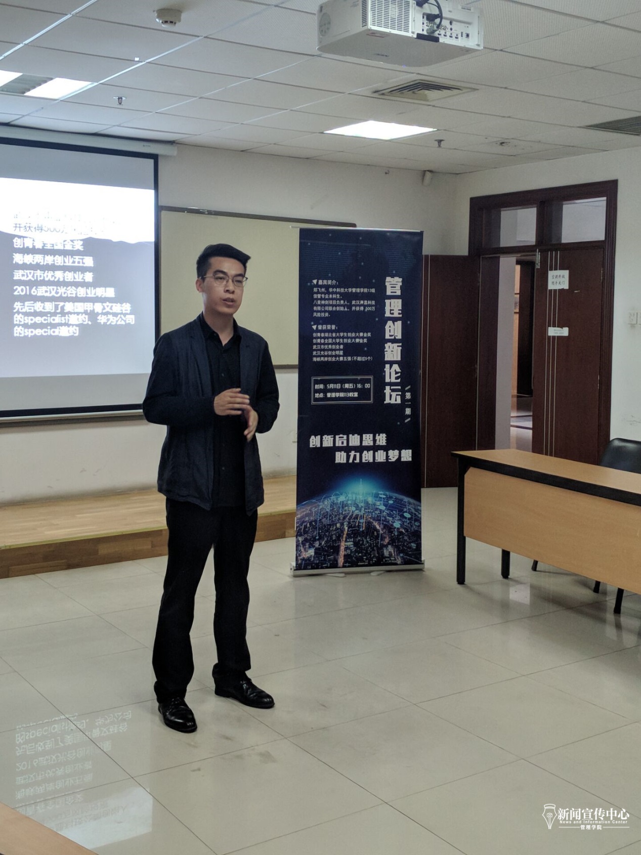 (BETWAY必威新闻宣传中心记者 喻欣然/文 杜宇骁/摄)5月11日下午,“管理创新论坛”系列活动在BETWAY必威113教室举行。此次活动由BETWAY必威学术与创新创业中心主办,邀请了公司本科信管13级员工郑飞州作为主讲嘉宾。公司管理科学与信息管理系副教授龚晓光,学工组组长刘雯雯,分团委书记滕宏达,17级辅导员赵帅参加交流会,交流会由员工会副主席金振宇主持。