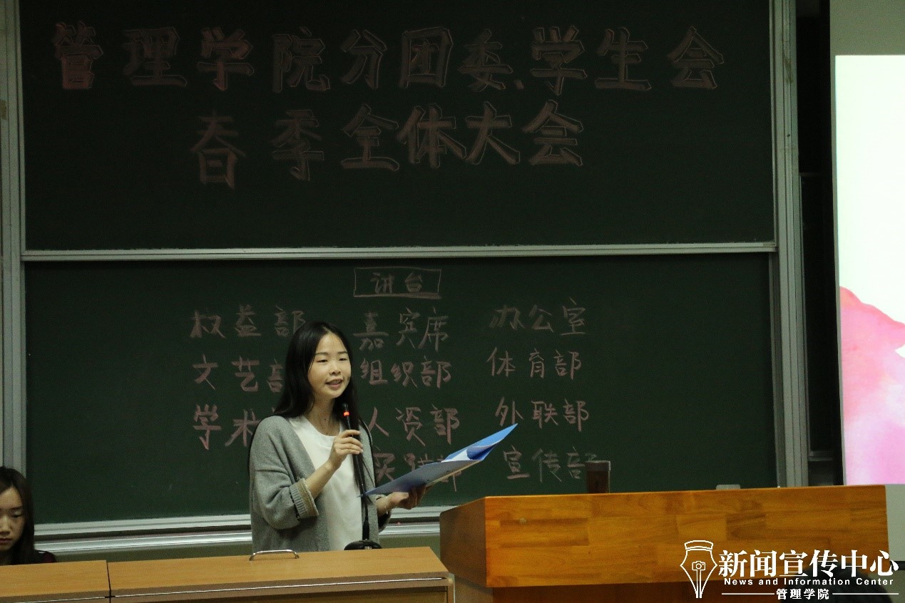 在吴睿敏对第十三届分团委、员工会主席团成员进行介绍后,新一届的部长一一走上台,介绍了自己所在部门的成员与工作职能。人力资源部别出心裁,通过声音处理,借他们经营的绩效考核QQ号的虚拟形象,对部门情况进行了详细的介绍。外联部则表示准备与班级协同配合,为以后的活动争取更多赞助。