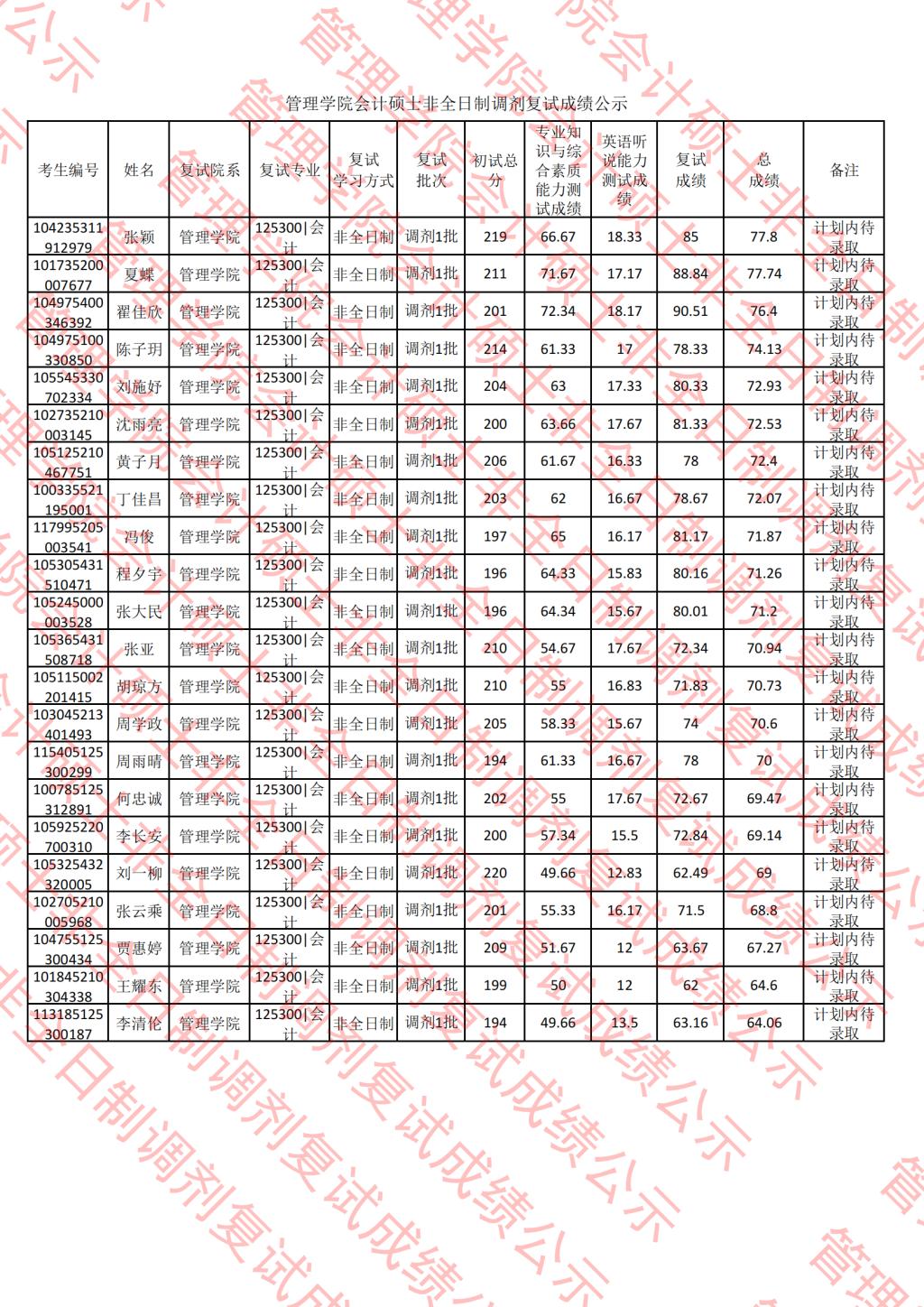 根据公司有关要求及《2025年会计硕士非全日制研究生复试调剂方案》,现将调剂复试成绩公示如下: