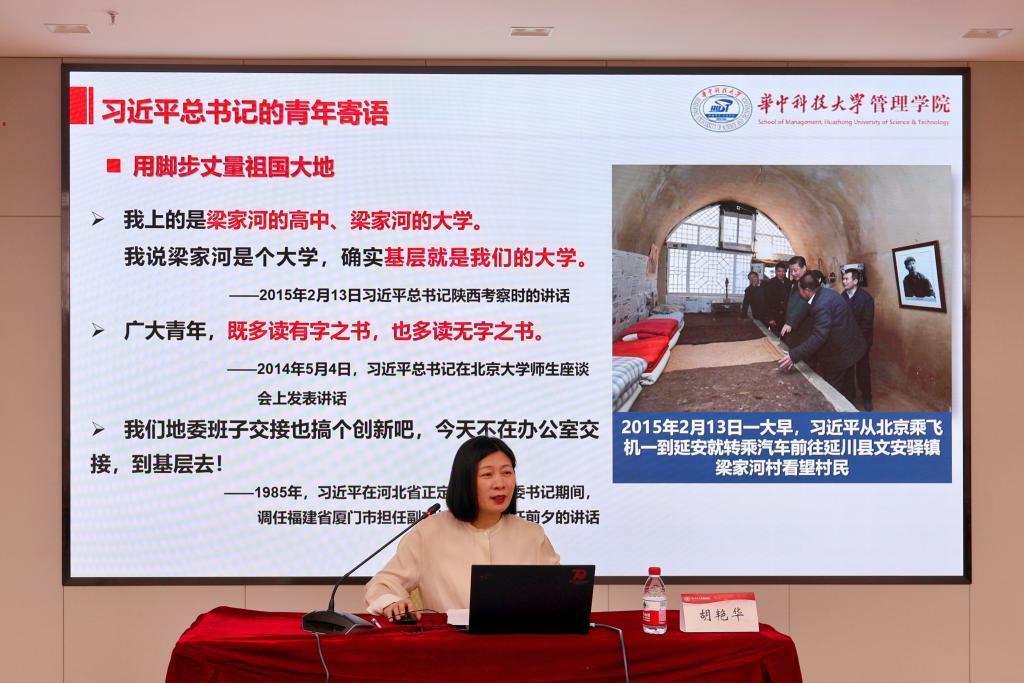 胡艳华以《当代青年老员工的人生价值与政治信仰》为题,为2024届毕业生党员、第十四期发展对象讲授学习领会习近平总书记关于青年工作的重要论述思政课。首先,她带领同学们重温了党的十八大以来习近平总书记对青年的寄语,结合华科大党员师生的优秀事迹,深入解读了“用脚步丈量祖国大地、用眼睛发现中国精神、用耳朵倾听人民呼声、用内心感应时代脉搏”的内涵。然后从“知”“情”“意”“信”“行”五个方面阐述了当代青年学子应具备的思想政治素质,号召同学们做奋发有为的新时代青年。最后,胡艳华希望同学们牢记习近平总书记的殷切期望,争做有理想、敢担当、能吃苦、肯奋斗的新时代好青年,在推进强国建设和民族复兴伟业中肩负起新时代赋予的责任与使命。