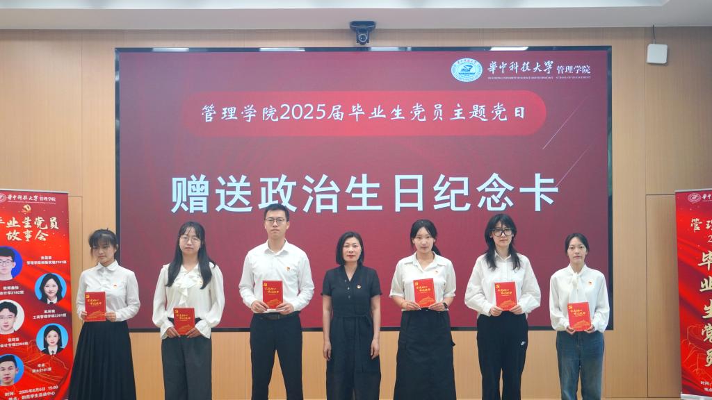 在“与毕业生党员同过政治生日”环节中,胡艳华为6月发展的毕业生党员代表赠送政治生日纪念卡,寄语全体党员铭记入党初心,把“为群众办实事”的信念融入日常工作中,在基层一线、科研前沿和服务阵地中发挥党员先锋模范作用。