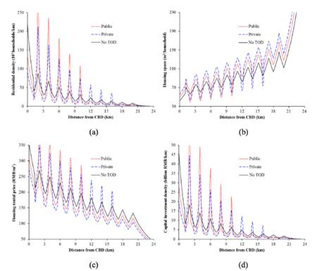Fig. 3.(a)-(d) represent household residential density, housing space per household, housing rental price, and capital investment density with and without TOD projects, respectively.