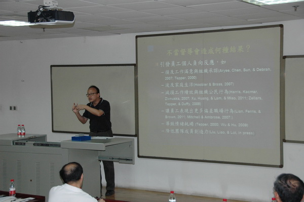 在报告中吴老师首先回顾了7月9日在报告中关于Abusive supervision的一些研究内容,然后就自己最近新的研究进展情况与在座师生进行了交流,主要包括 Abusive Supervision与情绪枯竭之间的关系研究、与情绪劳动之间的研究、以及不同类型的Abusive Supervision与情绪枯竭之间的研究。吴老师用生动的语言为在座师生讲述了不当领导对员工情绪、绩效的影响,使大家对负向领导领域的相关研究又进一步了解。同时,吴老师还分享了有关在投稿国际期刊时的一些有趣经验。报告结束后,吴老师与在座的老师与员工们就相关的研究主题与研究方法进行了探讨与交流。
