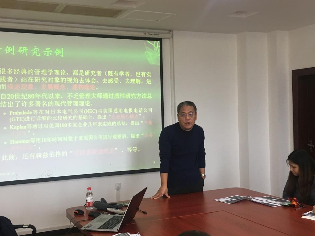 刘智强首先对郭会斌进行了简短介绍并对他的到来表示热烈欢迎。介绍过后,讲座正式开始,郭会斌分享了自己作为学术研究者的心得体会,并从质性研究示例、要素、定义、特性等方面作了详细介绍。在谈到质性研究定义为何时,郭会斌引用陈向明、白长虹、贾旭东、C·赖特·米尔斯等研究者的相关定义对其进行了分析和挖掘。关于质性研究的特性,郭会斌就其人文性、平民性和根植性、模式开放性和动态性展开了简要论述。此外,郭会斌进一步介绍了关于案例研究示例的相关研究内容,他表示“很多经典的管理学理论,都是研究者站在研究对象的视角去体会、去感受、去理解,进而描述现象,发展概念,建构理论。”由此,郭会斌阐述了案例研究的具体步骤,包括启动、案例选择、研究工具和程序设计、进入现场、数据分析、形成假设、文献对比、结束研究等。