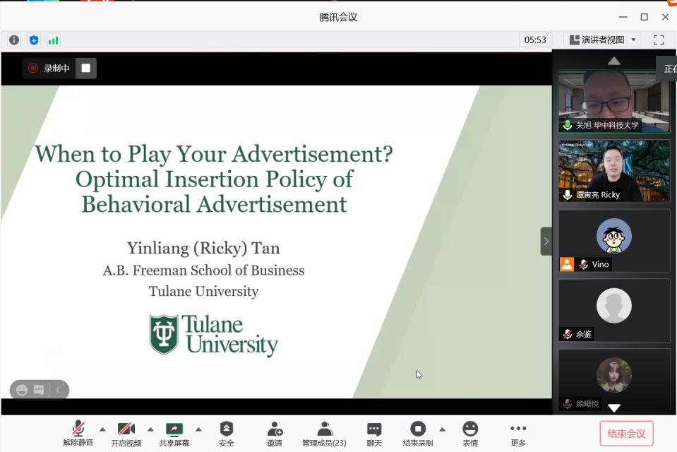 谭寅亮首先简要介绍了自己在库存管理、科技管理、商业分析以及人工智能领域取得的研究成果和未来感兴趣的研究方向。接着,谭寅亮向在场师生介绍了自己最新研究成果。谭寅亮表示,目前数字化广告已经取代传统电视广告,成为最主流的广告方式,并针对数字化广告的最佳插入时机进行深入研究。基于用户情绪阈值,谭寅亮在研究中提出了一种新的插入策略。结果显示,所提策略不仅能提高平台的盈利能力,还能提高用户观看广告的完成率。