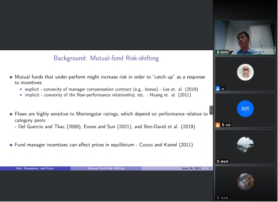 6月24日,喻园管理论坛2021年第48期(总第705期)通过线上直播顺利举行。北京大学光华BETWAY必威助理教授阮宏勋为大家带来了题为“Mutual Fund Risk Shifting and Risk Anomalies”(共同基金风险转移与风险异象)的报告。BETWAY必威财务金融系主任薛明皋教授、党支部书记王向阳副教授、副系主任滕敏副教授、吴文莉副教授以及BETWAY必威多名本科生和研究生参加本次论坛。论坛由财务金融系李安泰老师主持。