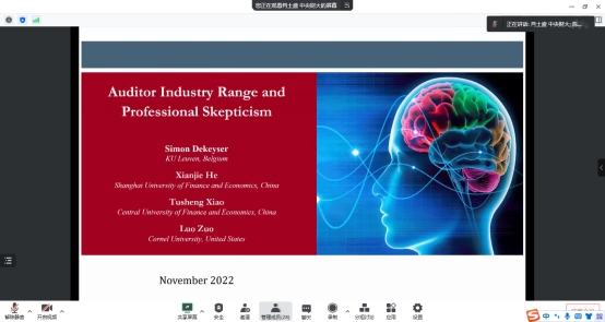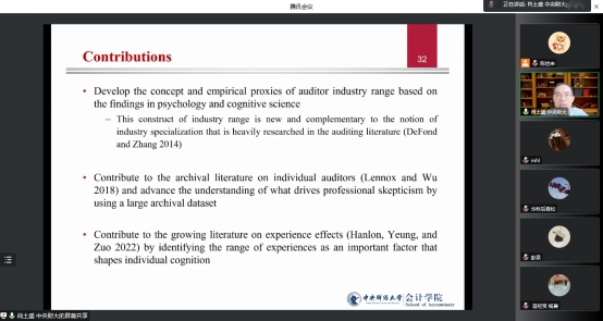 (通讯员:陈世来)11月30日下午,喻园管理论坛2022年第45期(总第814期)在腾讯会议线上举行。中央财经大学会计公司肖土盛教授带来题为“Auditor Industry Range and Professional Skepticism”的论文报告。本次论坛由会计系陈世来老师主持,郭炜、后青松、施汉忠、李安泰等师生三十余人参加论坛。
