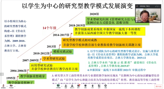 于桂兰的分享主要从《劳动关系管理》课程教学模式演变、灌输型教学模式存在的问题、解决问题的整体方案与具体方法设计、实施过程与效果、理论解释五个方面展开。在会议初始,于桂兰首先介绍了《劳动关系管理》课程的基本情况和教学模式演变,分享了“以员工团队为中心的研究型教学模式”如何经过十四个年级的教学实践检验并逐步迭代的过程,并介绍了带领员工团队完成调查报告和实证研究成果的经历。