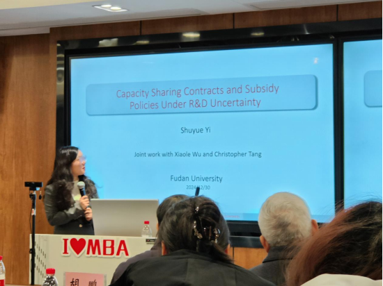 易殊玥博士以“Capacity Sharing Contracts and Subsidy Polices Under R&D Uncertainty”为主题进行分享。首先,易博士简要介绍了研究兴趣,研究成果和项目经历。然后介绍了制药行业研发成本高,药物研发漫长且成功率低的研究背景,研究主要探讨了产能共享合同和政府补贴如何激励药物的研发。易博士详细介绍了模型构建,考虑两个研发能力不同的企业,在研发结果确定前后进行产能投资和生产决策,市场需求取决于研发结果和产能投资量。研究发现,单位产能投资成本高时,产能共享会使企业增加计划产能。研发成功概率高的企业可能不接受事后产能共享。此外,在政府补贴方面,无产能共享时产能补贴优于生产补贴,且政府不应过度补贴以免加剧企业竞争;有产能共享时,很多情况下政府无需补贴,且此时产能补贴和生产补贴效果相当。