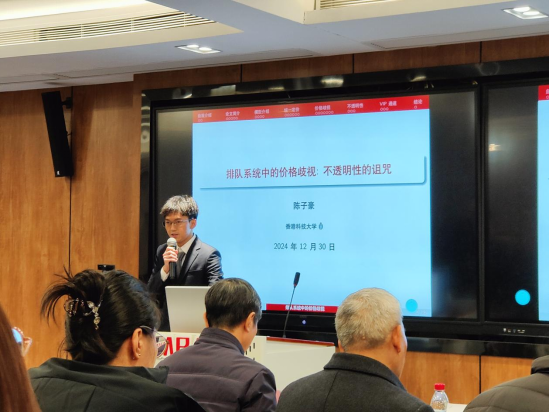 关旭教授代表BETWAY必威对来访的青年学者表示诚挚的欢迎。论坛开始后,陈子豪博士进行了简要的自我介绍,然后以“排队系统中的价格歧视:不透明性的诅咒”为主题进行分享,阐述了价格歧视和排队博弈问题的研究背景,讲解了此研究中不透明定价以及排队系统中的拥堵对垄断市场的影响以及抢占式优先调度策略两个难点。随后,他具体介绍了论文中的市场模型以及透明价格歧视模型。研究发现,即使是垄断市场,价格歧视也有可能降低利润,这是由于价格不透明以及排队系统本身有可能拥堵造成的。同时,抢占式优先调度是解决这个问题的一种有效的运营补救措施。