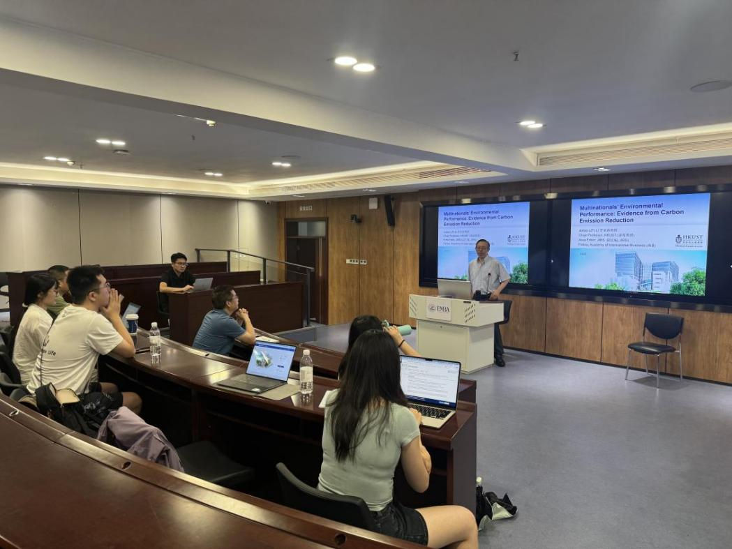 随后,分享了他的新研究——《Multinationals’ Environmental Performance: Evidence from Carbon Emission Reduction》。该研究基于注意力基础观理论(Attention-Based view),探讨跨国公司之间不同减排力度、地区间差别对环境保护的贡献问题。研究表明,跨国企业在不同区位开展的减排实践存在显著差异,这种差异取决于企业对各运营地气候变化减缓议题的注意力配置水平。该研究为理解企业环境、社会和治理(ESG)行为提供了新视角,强调跨国企业(MNEs)在全球运营中碳减排参与机制,对企业环保实践具有重要的指导意义。