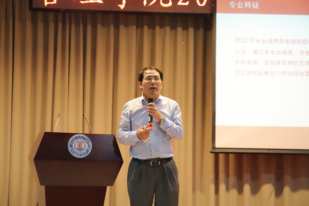 随后,五位老师分别对自己的专业进行了说明。廖建桥从专业内容、职业通道以及就读原因三个角度介绍了人力资源管理专业,而薛明皋则讲述了专业培养的特点、就业方向和学科培养体系。在财政方面,郑长军从财政税收金融的重要性、税收与生活、我国税种等方面进行了专业解疑。紧接着,占美松以"本科学习,会计专业和会计人生"为题,加深了同学们对于会计专业的了解,而常亚平则通过指出数字化营销是广泛串联各个环节,是发现社会需求、整合社会资源、满足社会需求、做生意的循环过程,进一步具体地介绍了营销的职业起点、前景和培养目标。