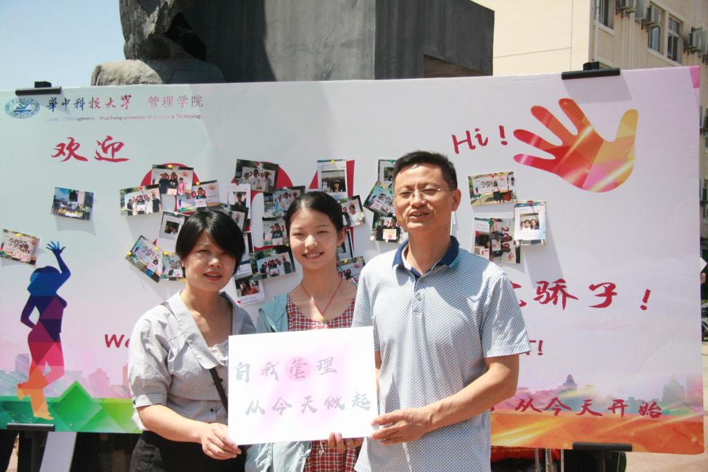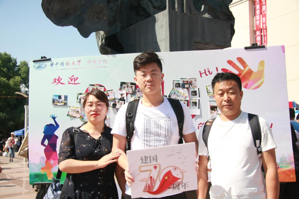 新生与家长在合影留念墙前合影。