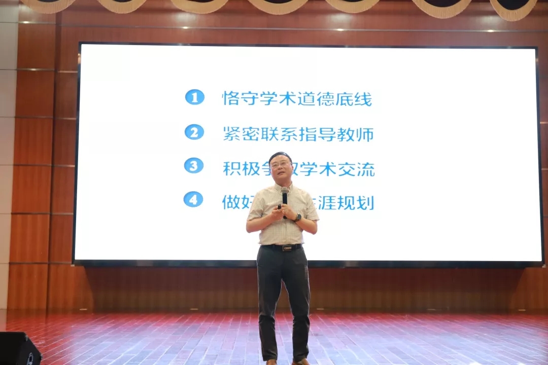 首先,王海军从恪守学术道德底线,紧密联系指导老师,积极争取学术交流和做好职业生涯规划四个方面与研究生新生进行了交流。他强调了导师作为第一责任人的首要任务是思想教育与业务培养相统一,介绍公司导师将密切关心研究生的思想、生活、就业、情感及心理健康。他要求各位研究生要坚决杜绝学术不端行为,一旦发生学术失范问题,要及时处理,不得推诿和隐瞒。最后他介绍了博士生需要把握的几个时间节点,其中包括撰写论文时间、资格审查时间及中期考核等,介绍了当前硕博士学位论文评审的新规定。
