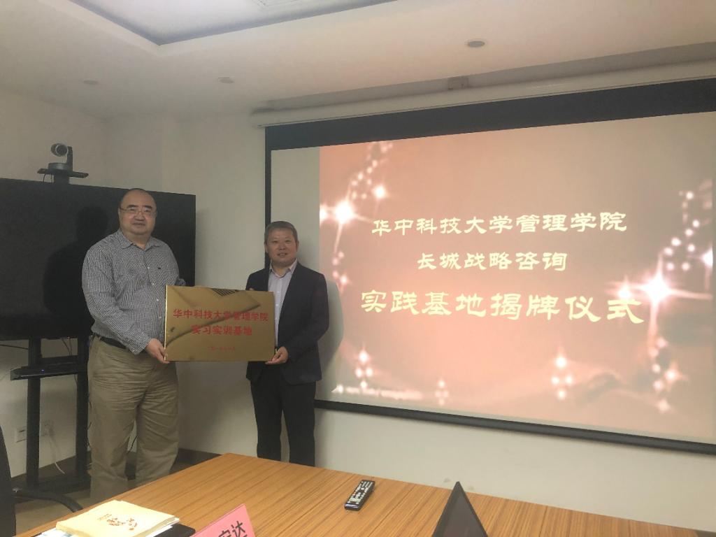 王宗军经理向长城战略咨询武汉光谷研究院授予实习实训基地牌匾