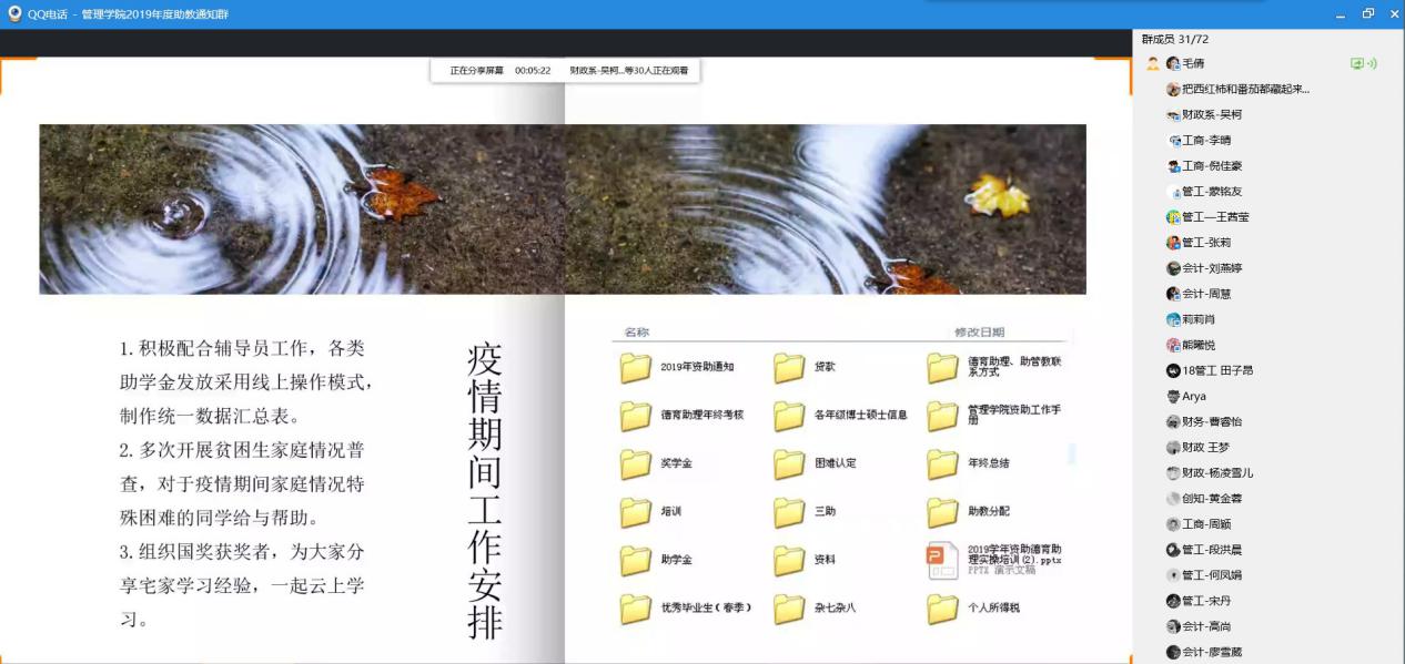 交流会伊始,资助德育助理毛倩进行了近期工作总结汇报,她分享了自己在疫情期间配合辅导员工作,开展贫困生情况普查以及组织云学习的经历。她表示,耐心、细致、认真负责、沟通就是她顺利完成一系列工作的致胜法宝。