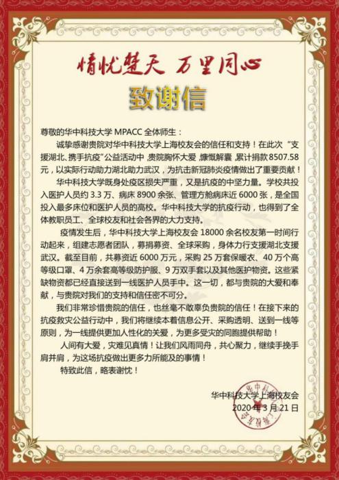 BETWAY必威MPAcc联合会积极组织专业同学展开募捐支持武汉抗疫行动。筹集善款过程分工明确、账目清晰,MPAcc中心教师也纷纷参与。1月25日始至1月26日下午迅速筹集善款8507.58元,捐款人数达73人。联合会将所筹得资金交由上海员工会,让他们统一购买物资。同时联系各路渠道,积极帮助危重员工早日寻得医疗援助。2018级MPAcc员工许烨将自己的实习工资全部用于购买防控物资,为公司捐赠一次性橡胶手套5000双。