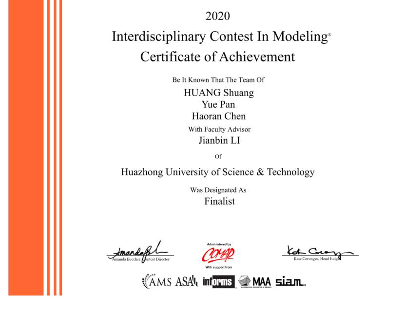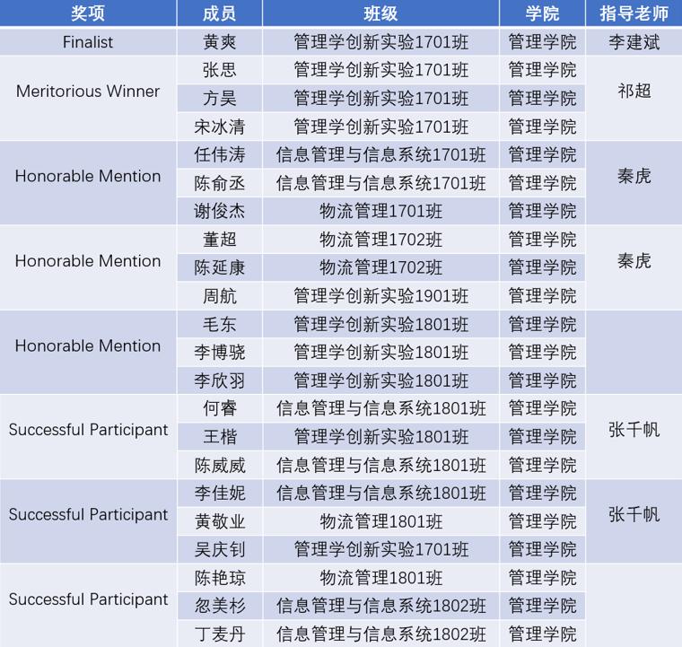 4月28日,2020年美国老员工数学建模竞赛(Mathematical Contest in Modeling/Interdisciplinary Contest in Modeling, MCM/ICM)成绩公布,2017级本科生共获得Finalist(特等奖提名)一项,Meritorious(一等奖)一项,Honorable Mentions(二等奖)三项,Successful Participant(三等奖)三项。