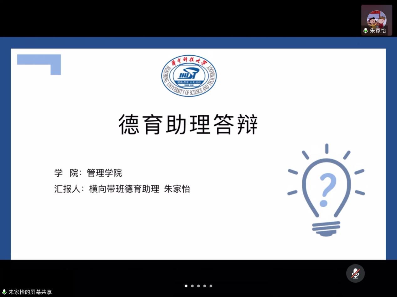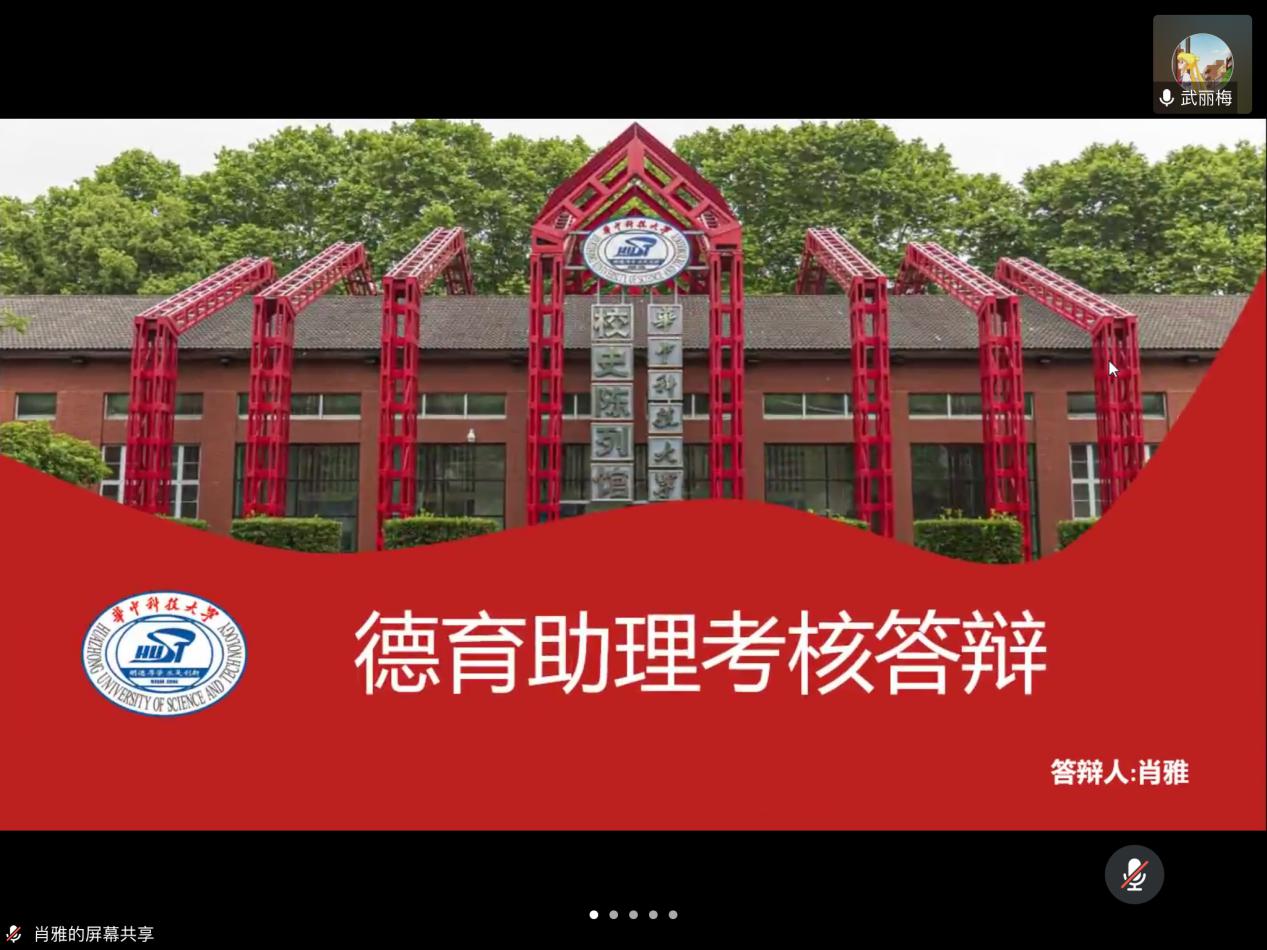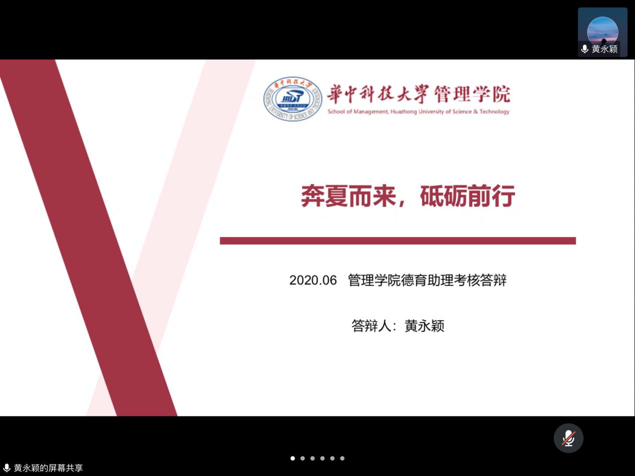 (BETWAY必威新闻宣传中心记者朱育欣/文)6月10日,BETWAY必威通过“腾讯会议”平台开展线上2019-2020学年德育助理述职答辩会,考核交流一年来的研究生育人管理工作。公司党委副书记李嵩、研究生辅导员罗秋韵、博士生辅导员杨沙迪以及公司全体德育助理参与了此次答辩交流会。