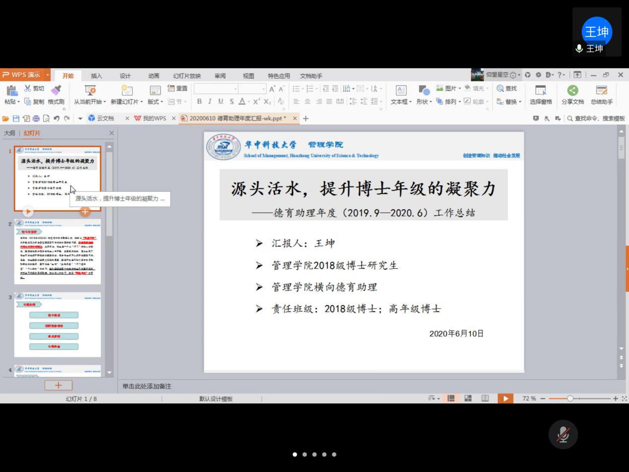 博二、博三年级横向德育助理王坤以“源头活水,提升博士年级的凝聚力”为答辩主题,结合个人的初心与目标,对过去一年的工作做出了回顾与总结。