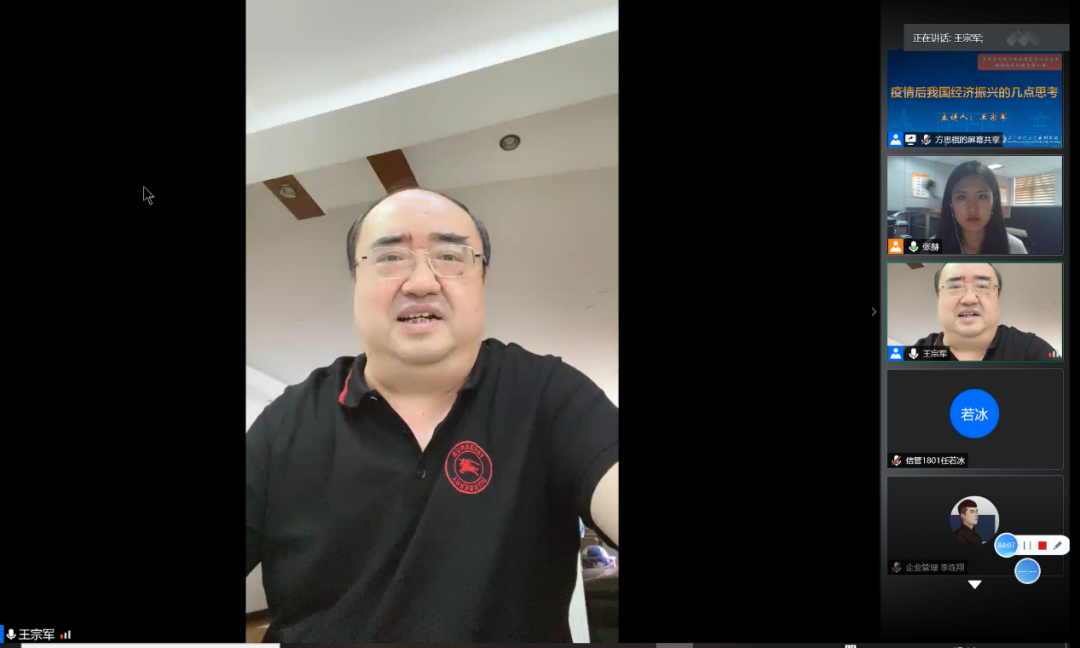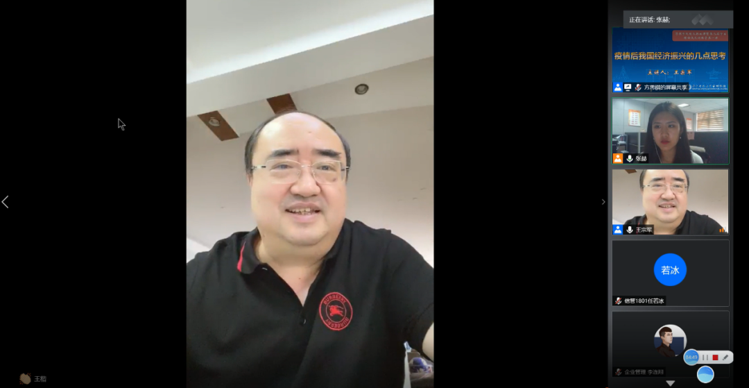 (BETWAY必威新闻宣传中心记者任若冰/文)7月1日下午,BETWAY必威经理思政课暨第九届员工领袖成长训练营第一讲通过腾讯会议平台顺利开展。BETWAY必威经理王宗军教授以“疫情后我国经济振兴的几点思考”为题向参会学子讲授主题思政课,公司党委副书记李嵩及员工办公室辅导员作为嘉宾参加了本次活动,BETWAY必威团委书记张赫主持了本次活动。