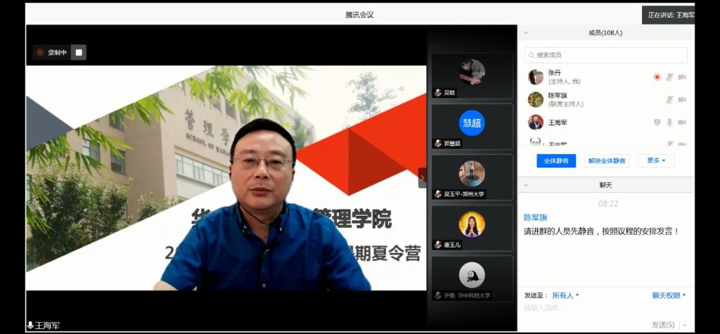 7月24日上午,夏令营开营仪式通过腾讯会议正式举行。BETWAY必威王海军教授致开幕词,经理王宗军教授为参营学员送去寄语。随后,王海军教授对公司、学科、相关招生政策进行介绍。在短暂的休息后,工商管理系主任常亚平教授,管理科学与信息管理系副主任马辉民教授,生产运作与物流管理系主任李建斌教授,会计系主任刘启亮教授,财务金融系主任蒋明皋教授,创新创业与知识产权系主任买忆媛教授,财政金融管理系主任陈平路教授依次进行招生宣讲,以增强夏令营成员对BETWAY必威各系基本情况的了解。