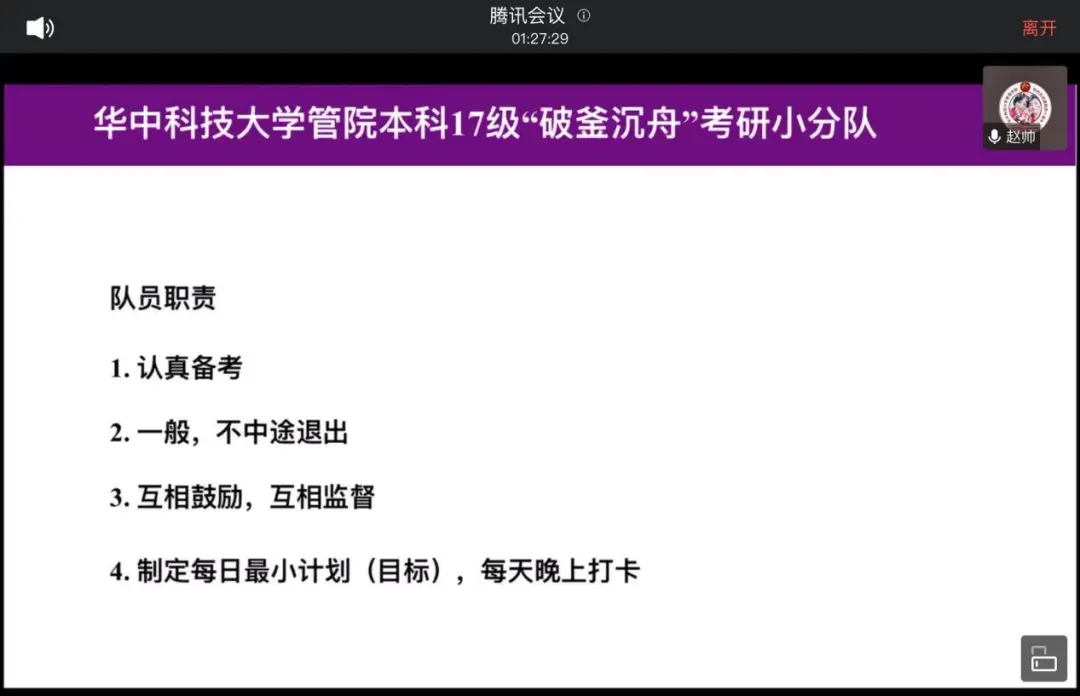 最后,为监督备战考研的同学,促进大家提高学习效率,赵帅带领大家建立本科17级考研小分队,将配备学长学姐进行指导支持,并设置相应奖励措施。同时希望大家全身心投入学习,如有需要的信息和资源将会努力帮助大家获取,助力同学们实现学业规划。