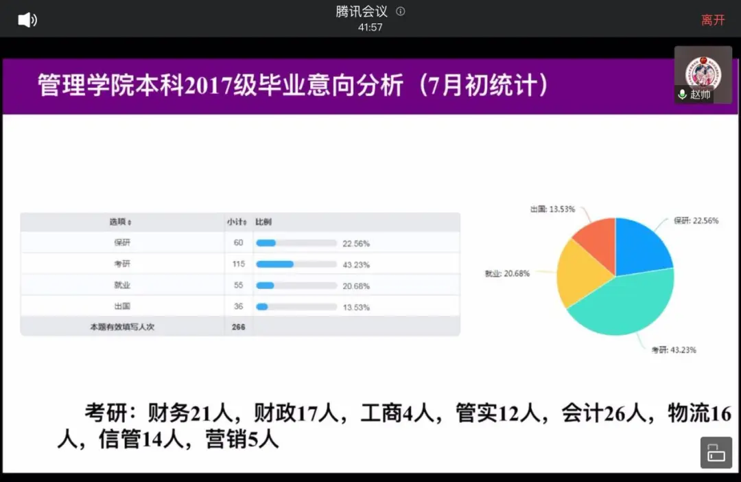 赵帅首先为大家分析了BETWAY必威历年考研状况调研数据,并通过在会前向大家发放267份问卷,统计了同学们毕业规划及意向。