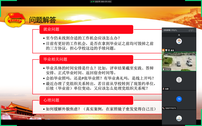 随后,支部全体成员结合自身情况,汇报了求职就业和科研学习等方面的情况,并提出了一些关于就业、毕业和心理方面的问题,研究生辅导员罗秋韵老师对此进行解答,并欢迎大家积极交流。