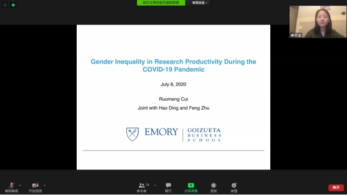 第一部分中,崔老师以“Gender Inequality in Research Productivity During the COVID-19 Pandemic“为主题进行了分享。崔老师以新冠疫情为背景,采用自然实验的方法,研究了COVID-19疫情导致的封锁对女性和男性学者社会科学研究生产力的不成比例的影响。通过对SSRN上来自25个国家的76,832位作者在两年的时间内,涵盖18个学科的41,858份数据进行处理,发现在美国禁闭后的10周内,尽管总体研究生产率提高了35%,但女性学者的生产率相对于男性学者下降了13.9%,并且这种生产力差距在顶尖大学的学者中更为明显。