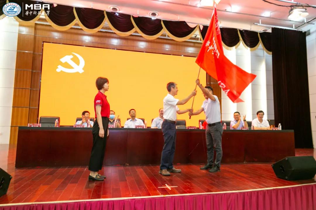 紧接着,公司党委书记金凌志主持授旗仪式,他从MBA联合会主席方杰手中,接过代表MBA精神传承的旗帜,郑重地交付给2020级新生代表洪思凡,希望2020级新生能够砥砺前行、不忘初心,将MBA精神更好地传递下去。