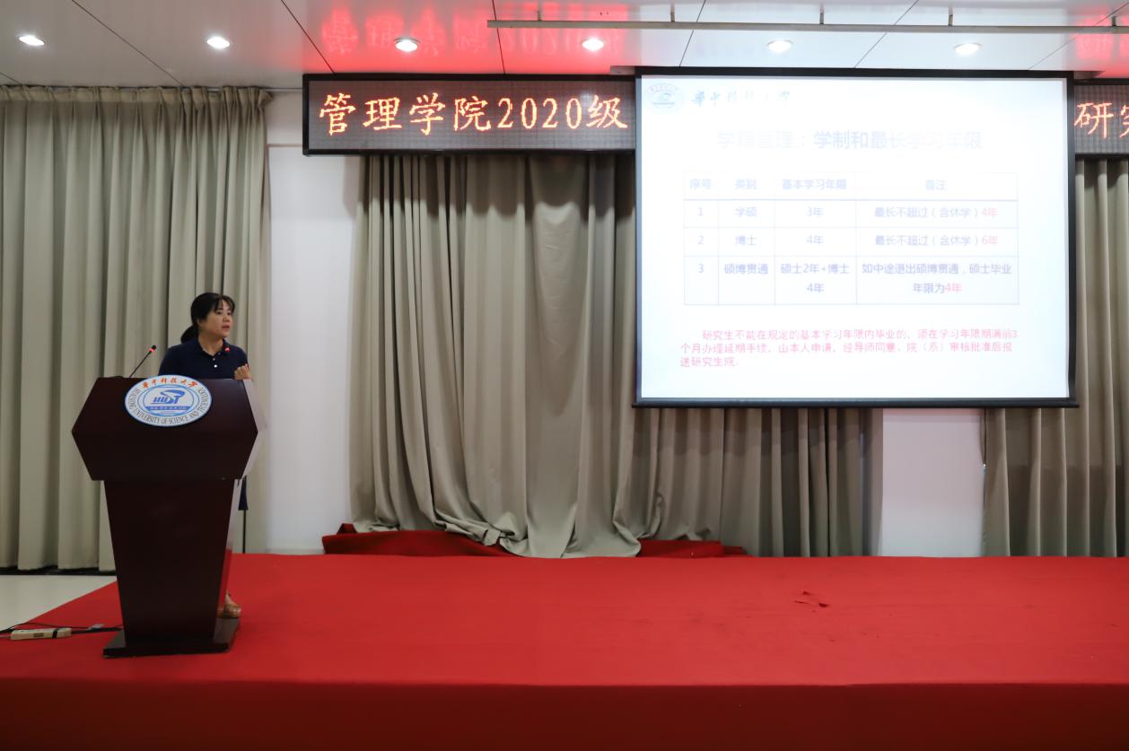紧接着,戴宁艳从校研究生院办事指南、院办公室指南、研究生入学注意事项、培养计划、学科专业构成、学籍管理、培养流程、学分要求、国内外学术交流和奖助学金等十大板块为同学们一一介绍,帮助了新生快速熟悉教学管理流程和培养规划。