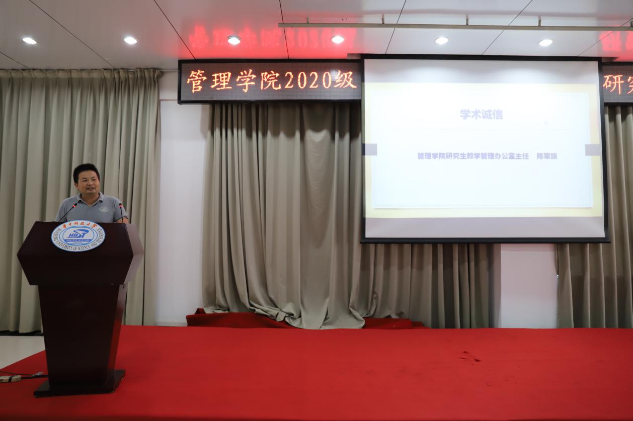 会议开始,陈军旗首先对“学术诚信”这一主题进行重点讲解。陈军旗表示,作为BETWAY必威研究生新生,拥有独立的研究能力尤为重要,学会理解知识并运用到实际更是关键。同时,在学术上一定要遵守道德规范,避免学术不端。陈军旗进一步强调了讲诚信、守诚信、用诚信的重要意义,鼓励大家秉承华中大的优良学风,做明德厚学、求是创新的“管院后浪”。