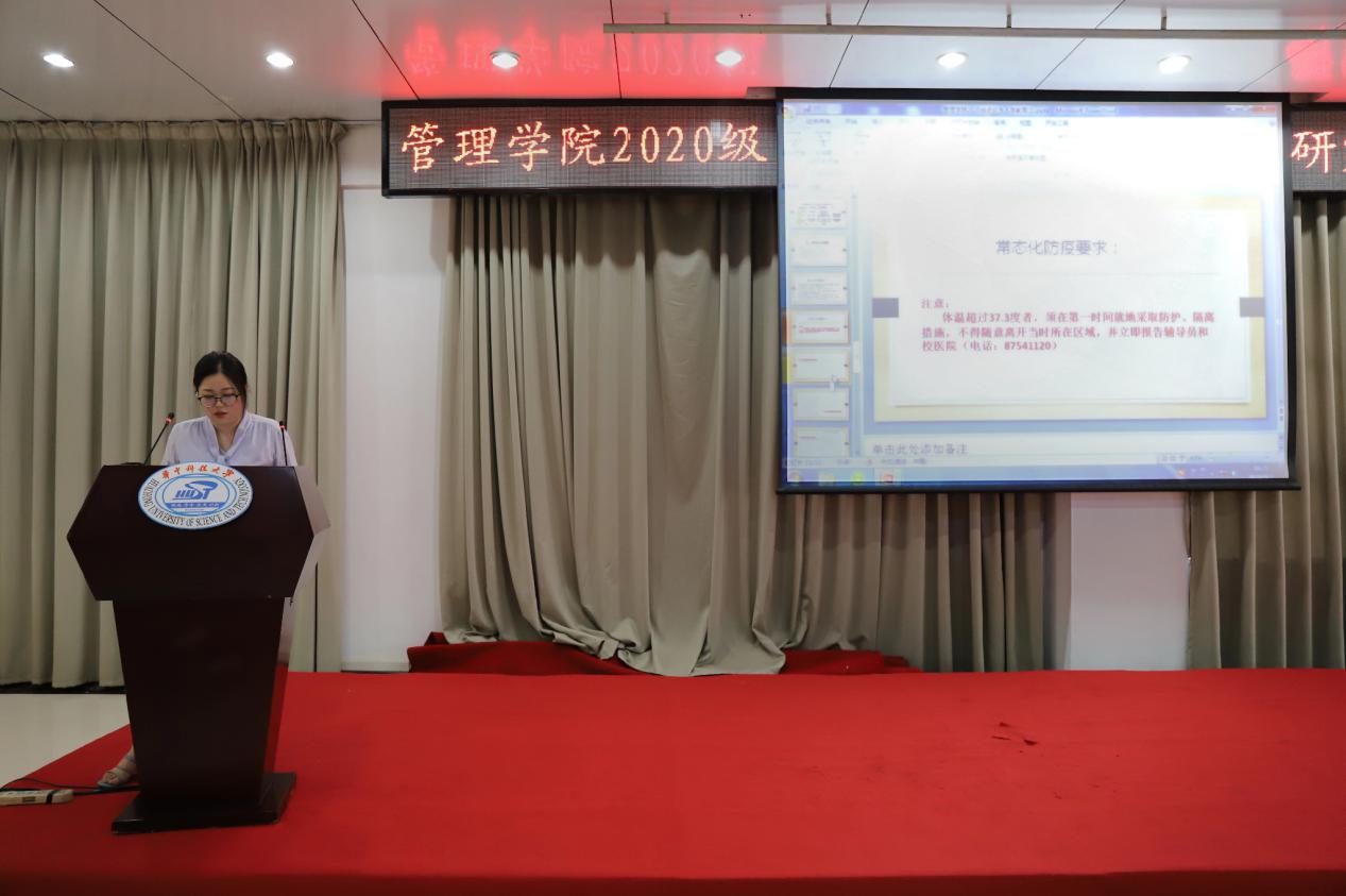 随后,罗秋韵向新生介绍了公司研究生工作队伍及相关事务的负责人,并从学风建设、职业发展、奖贷资助、文化建设、关怀教育、队伍建设六个方面讲解了研究生日常管理事务。罗秋韵着重讲解了新生较为关心的资助、贷款问题,并叮嘱新生提高警惕、防范诈骗,尤其要分辨“校园贷款”与“校园贷”。
