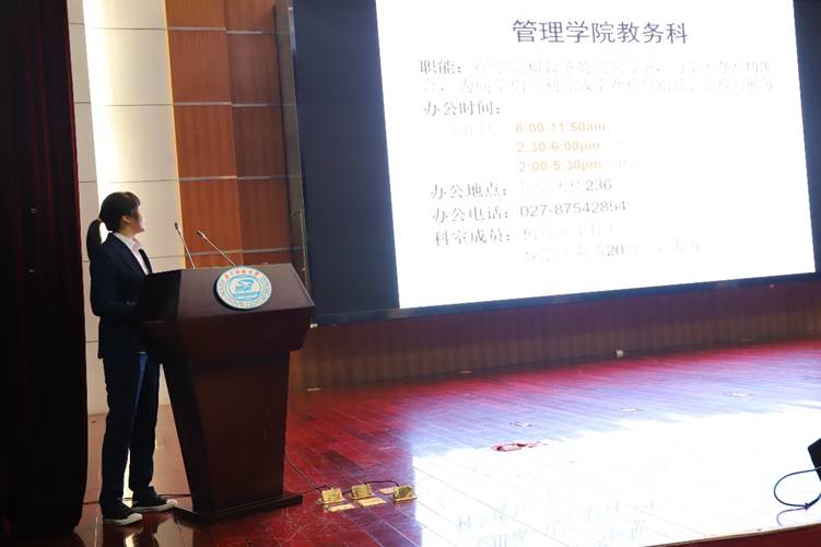 随后,魏洁从公司规章制度引入,从入学与注册、学习纪律、课程与学分、选课、课程考核与成绩记载、转专业、学分清理与学籍处理、其他事项等七个方面为新生进行了详细讲解,帮助同学们在课程教务方面答疑解惑的同时还对同学们在学习方面进行了贴心的叮嘱,助航同学们未来的学习生活。