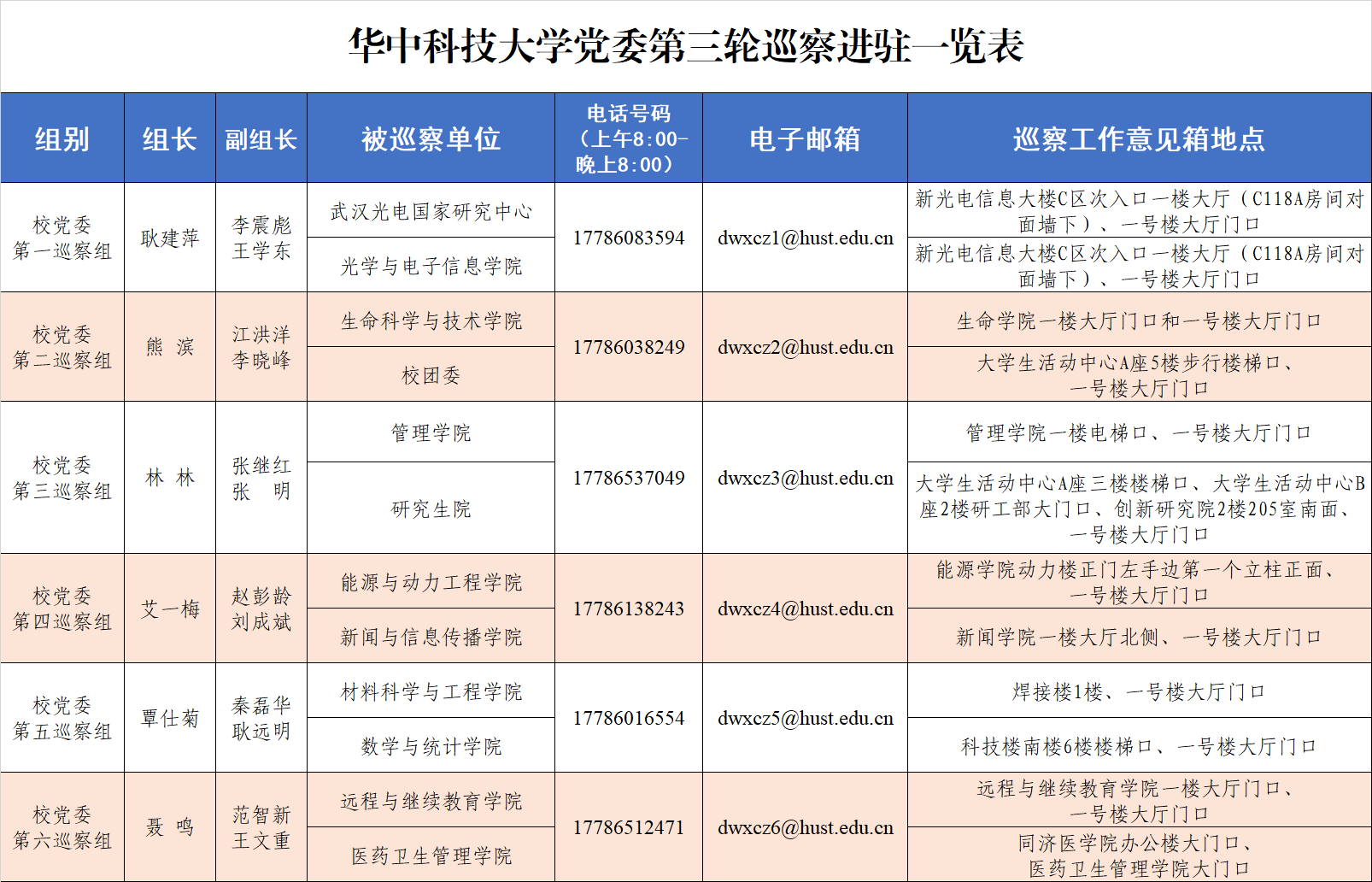 公司党委第三轮巡察的单位为:武汉光电国家研究中心党委、光学与电子信息公司党委、生命科学与技术公司党委、公司党委、能源与动力工程公司党委、新闻与信息传播公司党委、 材料科学与工程公司党委、数学与统计公司党委、医药卫生公司党委、远程与继续教育公司党委、研究生院、校团委。