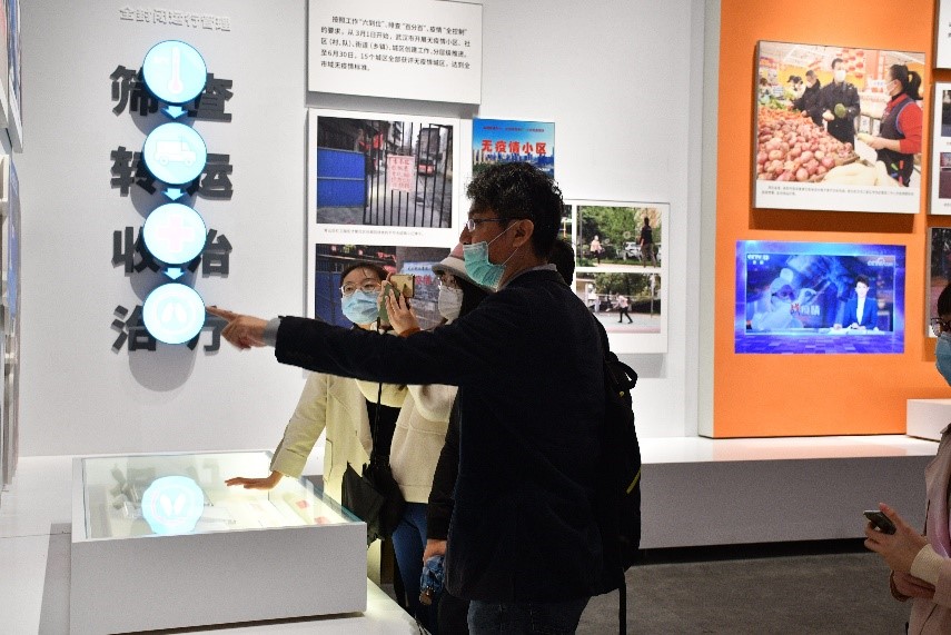 进入展厅后,研究团队依序参观了运筹帷幄、掌舵领航;团结协作、命运与共等6大部分,观看了纪实照片1100余张、抗击疫情实物展品1000余件、视频45个、抗击疫情还原纪实大型场景33处,近距离感受了波澜壮阔的抗疫“现场”,见证了疫情防控中的中国精神、中国力量和中国担当。