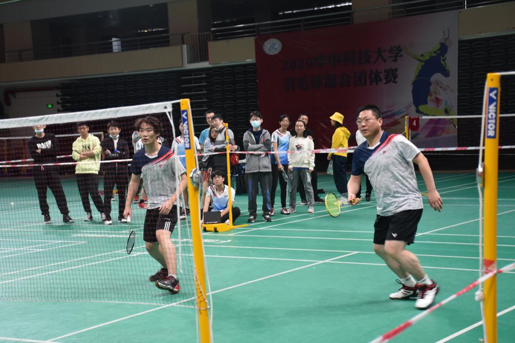第三场是男双(吴锐刚,姚德福)的角逐。第一局电气明显占优,快速抽挡和高压杀球频频施压,并以21:10先发头筹。第二局,管院做出调整,加强进攻的侵略性以暴制暴,一度打出4:0的梦幻开局,但最终依旧遗憾13:21落败,电气公司大比分2:1领先。