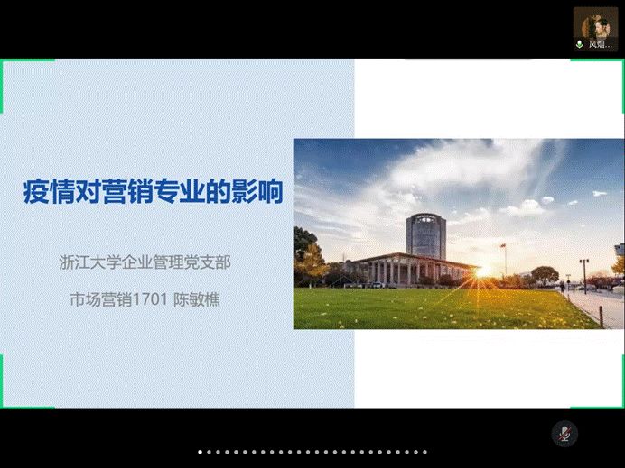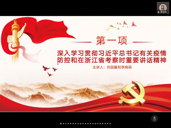 微党课环节,浙江大学的李晓萌同学围绕深入学习贯彻习近平总书记有关疫情防控的重要讲话精神的主题,领学了习近平总书记在疫情防控中提出的六项具体要求、六项重大部署、以及相关“金句”;浙江大学的刘园馨同学则回顾了总书记前往宁波舟山港穿山港区、宁波北仑汽配模具园区、湖州市安吉县天荒坪镇、杭州西溪国家湿地公园考察当地复产复工和生态保护情况,领学了习近平总书记在浙江省考察时的重要讲话精神。随后的交流分享环节,浙江大学的陈先宇同学表示在了解了党中央的各项部署和要求后,更加明白了肩负在员工党员身上的责任,应配合党和政府的工作,尽快打赢疫情阻击战;曹京京同学认为正值危机并存之际,应积极捕获创新机遇,践行党员责任与义务。BETWAY必威的黄婕同学表示,应牢记习近平总书记的嘱托,坚持生态保护和绿色发展的理念,去实现中国经济的可持续发展;龚昭同学表示,党中央对小微企业的帮扶有目共睹,应对中国经济的明天充满信心。