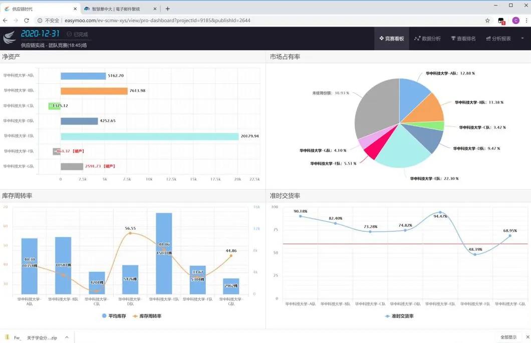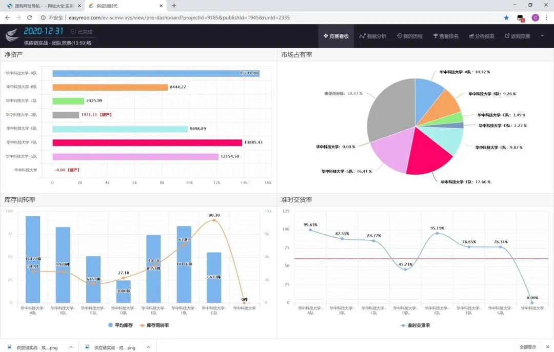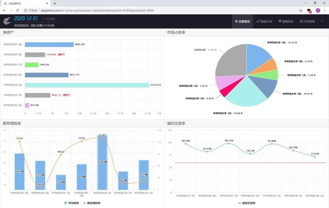 参赛队伍使用校园赛账号登录竞赛平台,模拟经营一家虚拟企业的供应链全过程,每场比赛运营周期为一年,历时约四小时,所有阶段完成之后,系统自动根据各项指标进行评分。第一场比赛在3月12日下午,比赛一开始来自自动化公司的F、G两支队伍就在各项指标上表现得十分亮眼,并且一直将这样的优势保持到了最后,另外来自BETWAY必威的A队前期成长缓慢但后来居上发展迅速,也表现得十分优秀。第二场比赛在3月18日晚上,这一次来自BETWAY必威的E队对之前的策略做出了极大调整,在激烈的市场竞争中脱颖而出,以95分的成绩拿下了本场比赛第一名。第三场比赛在3月19日下午,本场比赛中E队继续保持强劲势头,毫无悬念地拿到了第一。