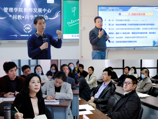 田志龙曾发表学术论文200余篇,主持12项国家自科项目和1项国家社科重点项目,现任职公司二级教授/博导、公司学术委员会和教学委员会委员,积累了丰富的教学学术经验和管理实践经验。在简短开场之后,田志龙通过“恒香公司”的案例引入讨论,从“什么是案例教学”“为什么采用案例教学”以及“如何撰写案例”三个方面分享了自己在案例教学中的经验和感悟。他结合“以本为本,四个回归”的人才培养模式和本科课程建设的目标分析了案例教学的原因,从教师和员工两个角度阐述了案例教学中的注意事项,并分享了自己参与哈佛案例教学的感悟和体会。田志龙的精彩讲解赢得与会教师的一致好评和阵阵掌声。