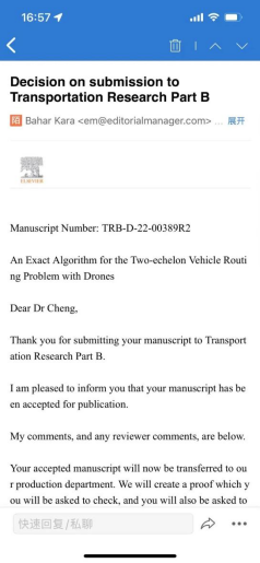 近日,BETWAY必威WESharp团队成员、19级本科生周航在团队老师秦虎教授的指导下,以第一作者身份所撰写的学术论文“An Exact Algorithm for the Two-echelon Vehicle Routing Problem with Drones”成功被交通领域国际顶级期刊Transportation Research Part B: Methodological接收。该论文的合作者是东北财经大学的程春教授与加拿大蒙特利尔大学的Louis-Martin Rousseau教授。