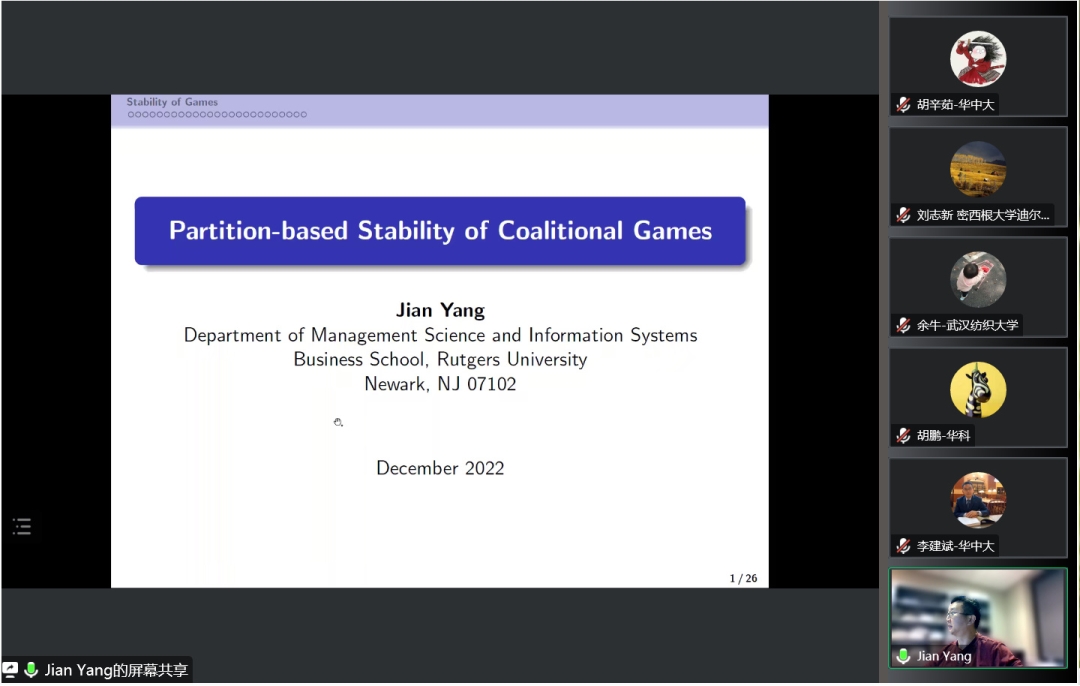 杨健以“Partition-based Stability of Coalitional Games”为报告题目,通过分割理论(即从大联盟分割成小联盟)的博弈方式,引入“诱惑”测试联盟的聚变与裂变的抵抗力,其算法最终能够在博弈中获得稳定解,实现了博弈的普适性。